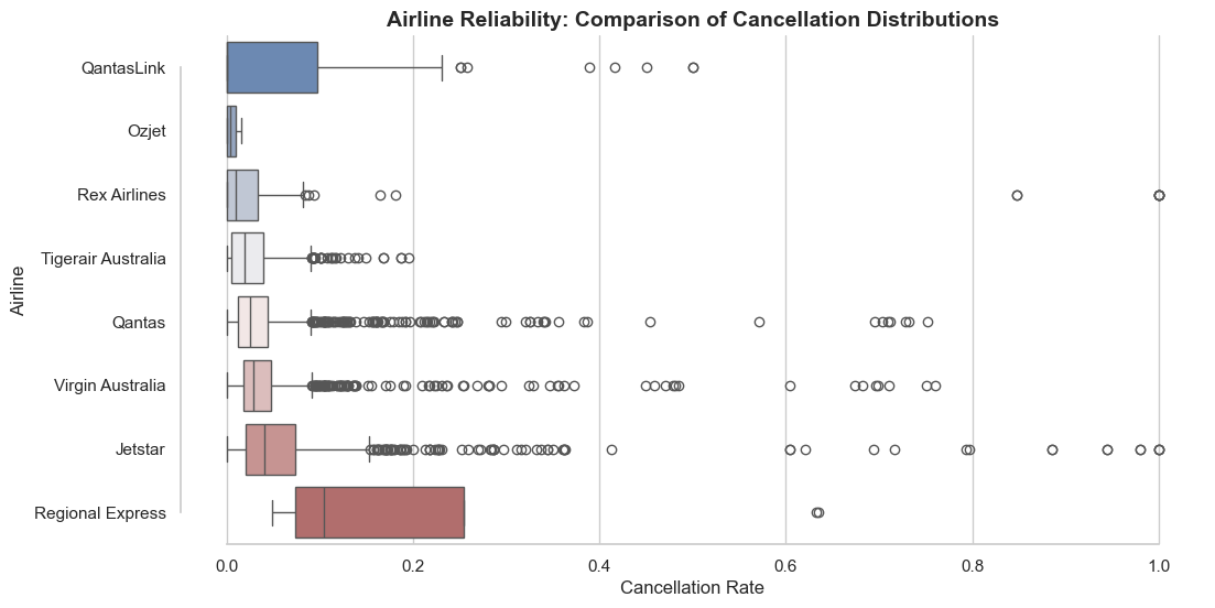 - High Variance: Jetstar and Tigerair show a wider spread in cancellation rates, indicating higher operational risk.