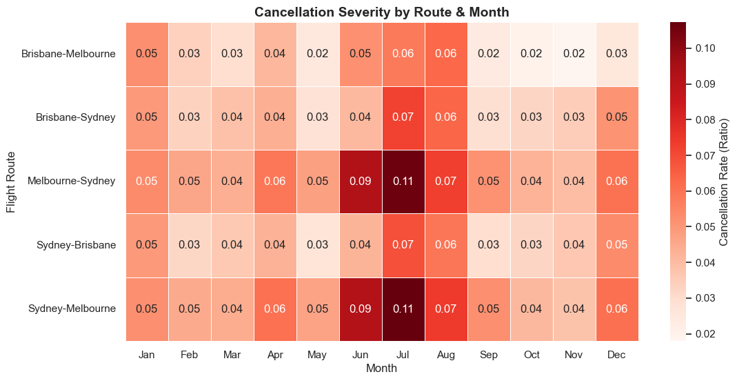 - Finding: Flight cancellations spike significantly during the Australian winter months (June & July).